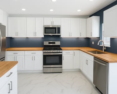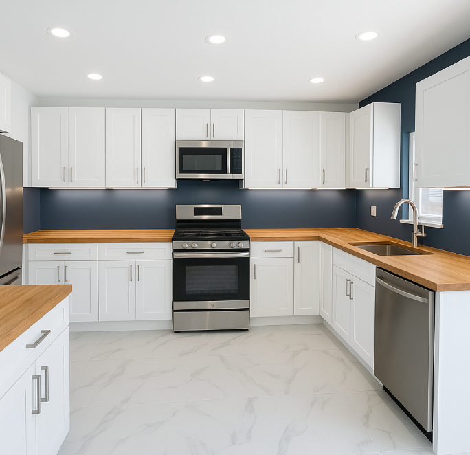 The countertops are crafted in a warm wood finish, bringing natural texture and contrast to the bright cabinetry. Their clean lines and seamless integration across the kitchen create a cohesive and polished workspace, ideal for both everyday use and stylish presentation.
