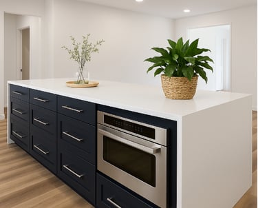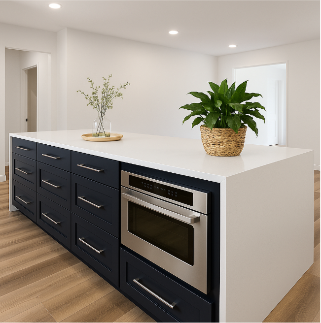 The countertops are made of high-quality white quartz, known for its durability, low maintenance, and luxurious finish. With a waterfall-edge island and expansive surface area, this design not only enhances functionality but also creates a stunning focal point for gatherings and everyday use.