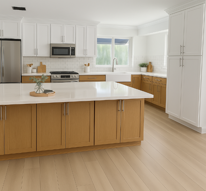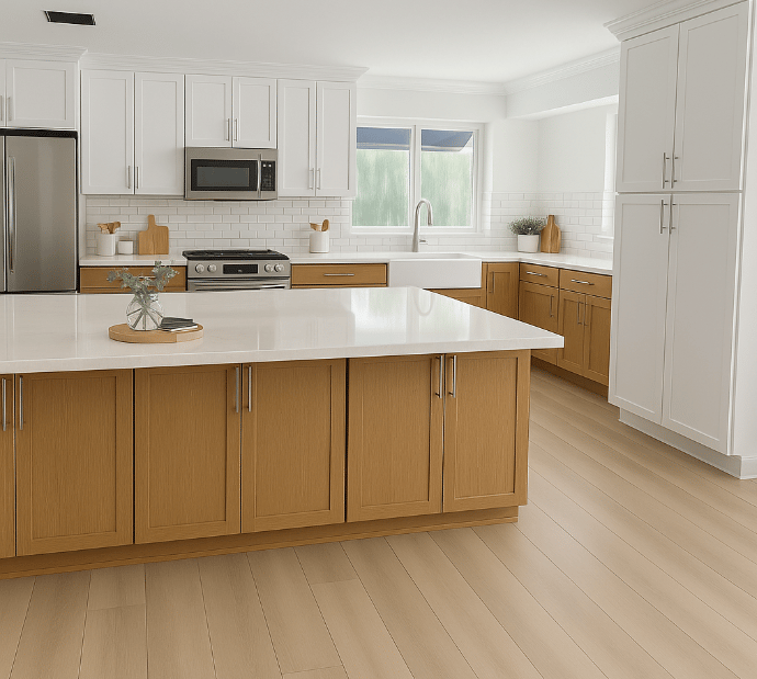 This kitchen showcases a sophisticated blend of modern design and timeless craftsmanship. The two-tone cabinetry features clean white upper cabinets paired with natural wood shaker-style lower cabinets and island, offering a warm yet contemporary aesthetic. The sleek stainless-steel handles provide a subtle modern accent, enhancing the overall elegance of the space.